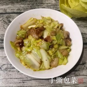 加入包菜翻炒至透亮后加入醋,糖,生抽调味。