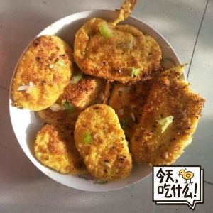 然后把馒头沾上打好的鸡蛋,在沾上面包糠,放入平底锅里,(注意,火候别太大)