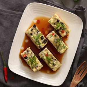 6.蒸箱选择普通蒸模式,100度,蒸15分钟。时间到后取出,晾凉。切块摆盘,用小葱装饰后即可食用。