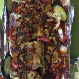 在烧酱汁的时候把煎好的鱼放到烤盘里,放上一点喜欢的配菜,大白菜,青瓜,豆芽,西芹,土豆…喜欢吃什么就买什么回来放吧,先放一点就行,后面把鱼消灭得差不多了剩下还有很多汤汁,正好继续放配菜来吃