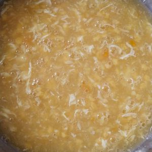 清水适量入锅,冷水下一勺吉士粉,和适量白糖搅匀,锅烧开放入玉米片煮一会,煮玉米片的同时把淀粉和适量清水调成淀粉糊,再把淀粉糊下到玉米片锅里,搅匀(可以尝一下味道,喜欢喝甜的,可以再加点糖)。