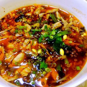 另起油锅烧至5成热将辣椒花椒倒入油中炸至变色泼入碗中,撒上小葱花。