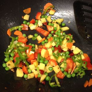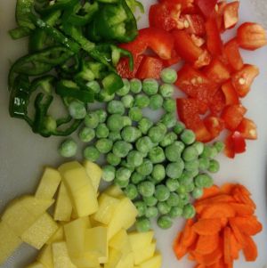 各种切丁,胡萝卜土豆红椒各小半个,青椒一个