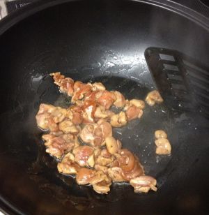 油烧热后下腌制十分钟的鸡肉爆炒三分钟到熟了起锅