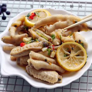将辣椒、蒜头、香菜切碎、柠檬切片,把百香果、辣椒、蒜蓉、香菜、柠檬片、2小勺生抽、1小勺盐和1小勺糖倒入鸡爪中,拌均匀。