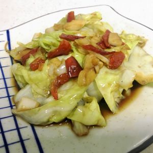 做完了我才发现我忘了拍图,这图我也是借来的,第二部,锅内放油,油热后放入干辣椒跟蒜炒香紧接着放入包菜翻炒加入少许盐,待包菜瘪下来时倒入调好的汁,完全渗透以后就可以出锅啦。