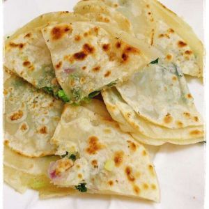 刷油,撒上葱花,饺子皮一层层往上叠加,大概5层的样子,擀成薄饼