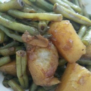 土豆,豆角一起倒入锅里翻炒,加入盐,花椒粉和老抽翻炒均匀。