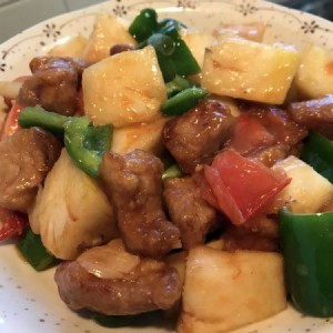 菠萝,番茄,青椒切丁,热锅下蒜末,然后番茄,炒一会儿出汁后下菠萝和青椒,翻动几下就可以放里脊肉,最后一点盐,酱油,耗油,起锅装盘