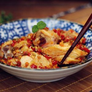 把2勺鸡汤加入调味汁中拌匀,浇在鸡块上,再撒上花生碎和芝麻,香辣诱人的口水鸡就做好了。