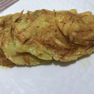 锅里放油,小火热油。舀一勺面糊,倒进平底锅。用勺子压平表面的胡萝卜丝和西葫芦丝,饼要薄薄的一层,煎出来的饼才会脆脆的。