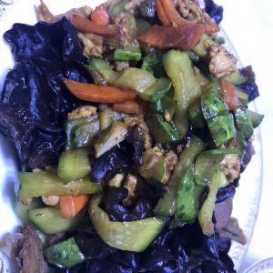 原料,木耳提前泡上,旱黄瓜不咋大,要是水黄瓜长的话一根就够了