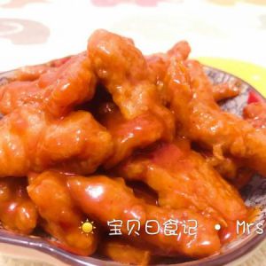 锅中直接加番茄酱、点少许白醋、加入适量盐和糖,加入少量水,倒入炸好的里脊,点入水淀粉勾芡,大火收汁盛出装盘。