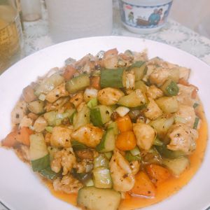后加入炒熟的鸡肉丁,黄瓜丁与胡萝卜进行翻炒。