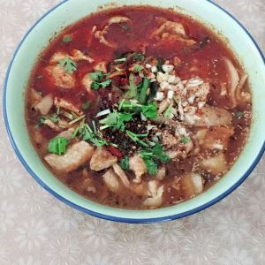 把汤全部倒入。放砸碎的辣椒、花椒、蒜末、芝麻。然后烧热油浇到上面。