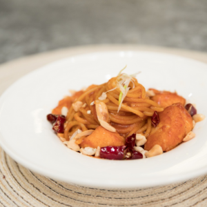 加入已过水煮熟的意大利面,水淀粉勾芡,搅拌翻炒至收汁