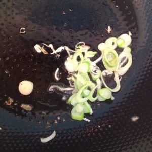 油锅下蒜片、葱花炝锅出香味