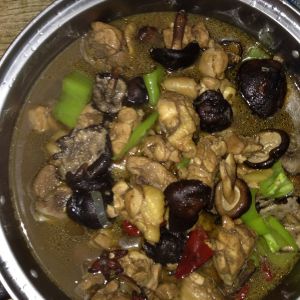 放入香菇翻炒五分钟后,放入一大碗蘑菇水(泡蘑菇的)