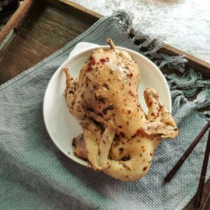 椒盐、老干妈,适量水,中火煮30分钟,期间往鸡身上浇入汁水,收汁即可。