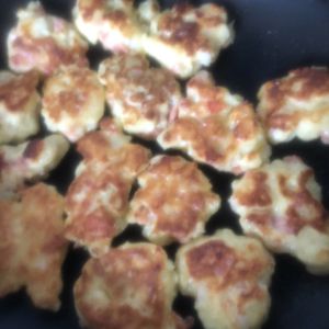 火腿肠切丁,虾仁切碎加入土豆泥~再加入鸡蛋和面粉,加入适量水搅拌均匀!按照口味放入盐、鸡精、胡椒粉等