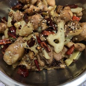 因为鸡腿本身就炸熟了,不用翻炒太久,出锅撒上芝麻就可以开动啦。我还加入了藕片,藕片也是需要炸的哈(最好是先炸藕片,再炸鸡腿)。