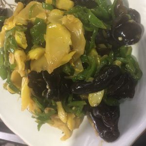 加入酸菜,木耳,青椒丝,翻炒,加入鸡精味精盐,生抽,糖。