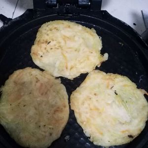 电饼铛中预热后加油,稍微多放一些,然后把拌匀的面糊放入电饼铛,一次不要放太多,面糊用木铲压薄一些