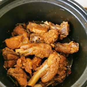 砂锅里倒少许油,(保持中火)油热放八角和姜片,20秒后放冰糖搅拌融化,放葱段煸炒出味放排骨,用筷子翻拌几下,倒入料酒、生抽、老抽,翻拌均匀加水沒过排骨,加入炖肉料,盖上盖子煮沸转小火慢炖。十分钟左右翻拌一次(均匀入味和避免沾锅)。20分钟后放盐拌匀再煮10分钟左右关火焖10分钟。有点啰嗦,但却是我失败多次后总结出来的,学起来做给爱你或是你爱的人吃吧。n(*≧▽≦*)n