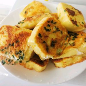 大火热锅,倒入少许冷油,然后转中火。大火很难控制火候,容易煎糊。小火又容易导致蛋液没有立刻凝固,馒头片吸入过过多的油脂。火候是一门玄学,大家根据自己家的锅和燃气灶实际情况选择最好的火候即可。