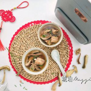将焯烫好的排骨以及泡过的野生白牛肝菌和干贝一起放入臻米脱糖蒸汽养生煲内胆中,放入姜片。