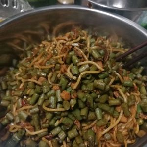 加入豆角翻炒,加入生抽,老抽,豆瓣酱,炒熟豆角