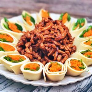 准备食材和工具:肉丝400克、蛋清1个、淀粉4克、料酒8克、盐2克、胡椒粉1克、胡萝卜1根、香菜适量、豆皮2张