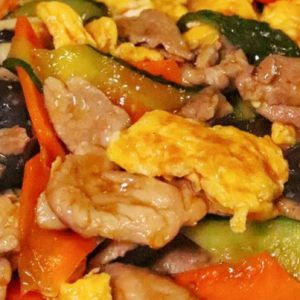 锅中留底油,放入肉片翻炒至变色,依次放入胡萝卜、木耳翻炒;
