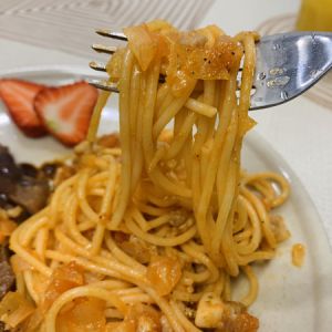 提前准备好肉末,番茄,意面,蒜,蕃茄酱,牛排