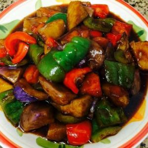 放入炸好的茄子,辣椒,炒的差不多放入蒜片翻炒一下就可以出锅了!!: