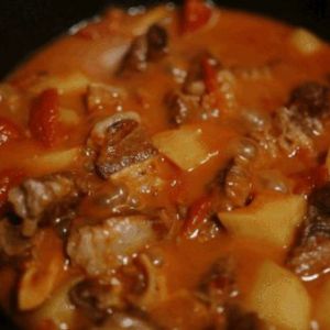 牛肉已经软烂之后,加入切好块的土豆,在土豆上面加一勺番茄酱,继续焖煮半小时即可。