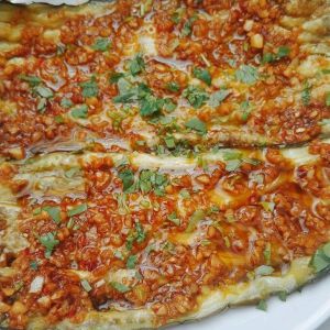 把蒜蓉酱料均匀的涂抹在展开的茄子上,撒上香菜碎就ok了!