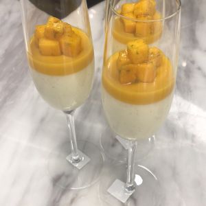 3. 取适量的芒果沙拉放在冻好的芒果奶油上,然后就可以上桌开吃了