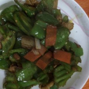 把油烧热放入猪肉炒一会,再放入青椒和胡萝卜还有葱,翻炒到青椒皮起泡,即可出锅食用。