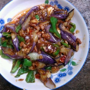 茄子切滚刀状,锅热油,油温六成热的时候倒入茄子炸一会,炸软了捞出,锅留底油