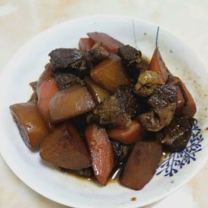小火烧至半小时至40分钟根据牛肉的熟烂度决定时间,加入白萝卜胡萝卜盖上锅盖转至大火烧开,转小火烧至10分钟,开锅盖转大火收汁,汤汁烧至粘稠关火装盆!
