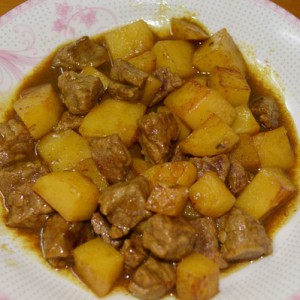 倒入腌制完的牛肉一起翻炒。至表面略熟后,倒入刚才腌制的咖喱,继续翻炒。然后等收汁啦。
