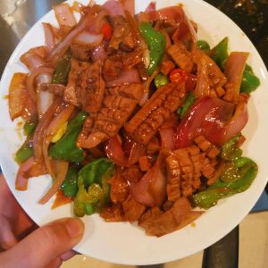 锅中倒入生姜,洋葱,青椒,小米椒翻炒。加入1勺盐,一勺生抽,