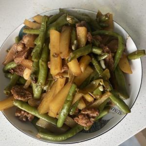 放入豆角,继续焖炒,如果感觉没有水分,可以稍微放些水,因为豆角比较难熟,所以需要焖煮