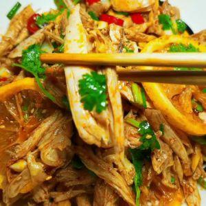 加入蒜末、小米辣、生抽、醋、盐、味精、辣酱油、香油、香菜、小葱、柠檬,拌匀