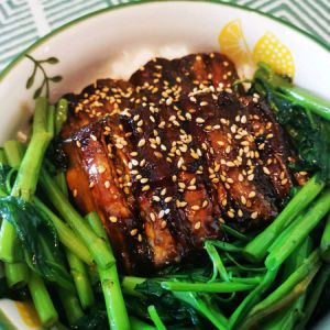 茄子铺在饭上,淋上酱汁,撒点芝麻。我说这不是鳗鱼你信吗?