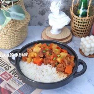 把米饭盛入碗中,浇上番茄牛腩,撒上葱花。