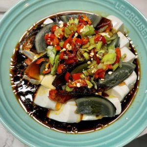把内脂豆腐放到盘子里,把水多控一控,一会儿就能出好多水