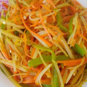土豆去皮洗净,尖椒和胡萝卜洗净备用切成细丝。土豆丝要用清水洗几遍。