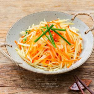 左手轻扣住食材,右手拿刀,将胡萝卜切成火柴棍粗细即可(前期的切片也很重要);